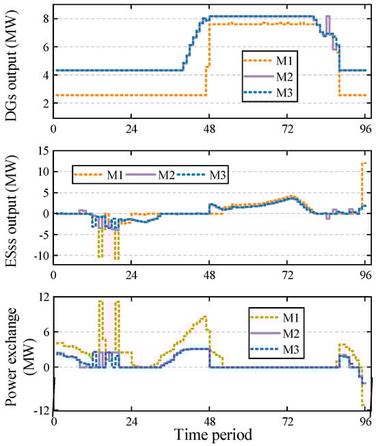 Table 7 presents the results under different stochastic optimization methods. It can be observed that the cost of C1 is lower than that of C2 and C3, but the maximum EVP exceeds the set threshold. This approach, which directly assumes a Gaussian distribution for the RESs’ uncertainty, clearly fails to meet the requirements. Both C2 and C3 satisfy the confidence level constraint, but the cost of C2 is higher than C3, despite its maximum EVP being well below 5%. This is because the moment-based ambiguity set can only utilize the mean and variance of historical data. In contrast, the Wasserstein distance-based ambiguity set can more comprehensively utilize the available data. Therefore, its conservativeness is reduced, but it can still balance conservativeness by controlling the ball radius.