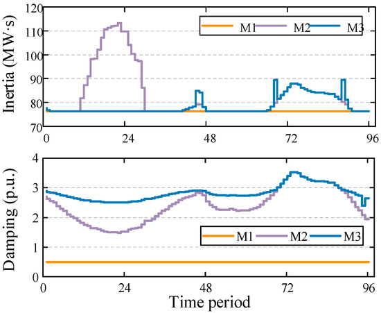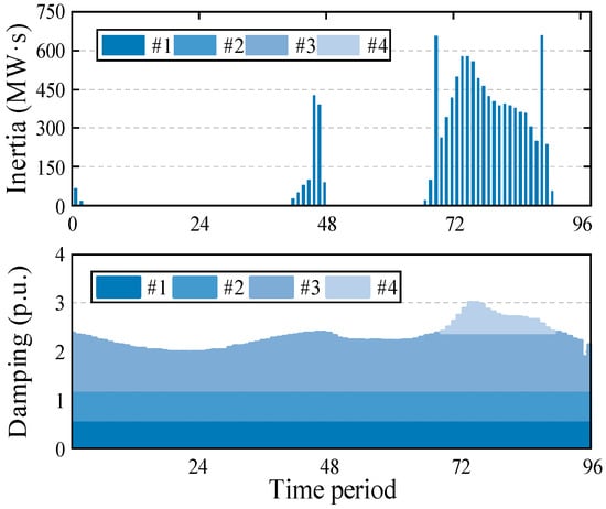 The proposed DRFC-ED scheduling framework is shown in Figure 2. The unit commitment has already been determined in the day-ahead schedule, so the online status of diesel generators is assumed to be already fixed. After each execution of the DRFC-ED, the system operator allocates the optimized inertia and damping constants to each ESS. Additionally, the settings for power and reserves will also be distributed to each device. Considering that excessive reliance on power exchange with the main grid can jeopardize frequency security after unintentional islanding events, certain limits should be placed on the power exchange.