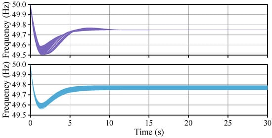 By performing the inverse Laplace transform on (5), the time-domain expressions for the frequency deviation function in both overdamped and underdamped cases can be obtained. The relevant derivation can be found in [29], where Δfmax is used to represent the expression of MFD. Δf(s), ωn, and ζ represent the frequency deviation, the natural frequency of the system, and the damping ratio, respectively. In (6), Hsys represents the aggregate inertia constant of the microgrid, reflecting the kinetic energy storage capacity; Ksys denotes the system frequency regulation gain, quantifying the primary control response speed; and Dsys models the composite load damping effect, which inherently stabilizes frequency deviations.