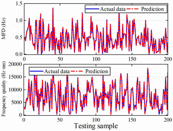 Training sets are generated within the feasible domain of the features in ψ1 and ψ2, and they are trained separately to predict the MFD and ITAE of frequency. Two linear layers are selected, which already achieve high accuracy. After training, the relationship between the predicted values and the features can be expressed using (15).