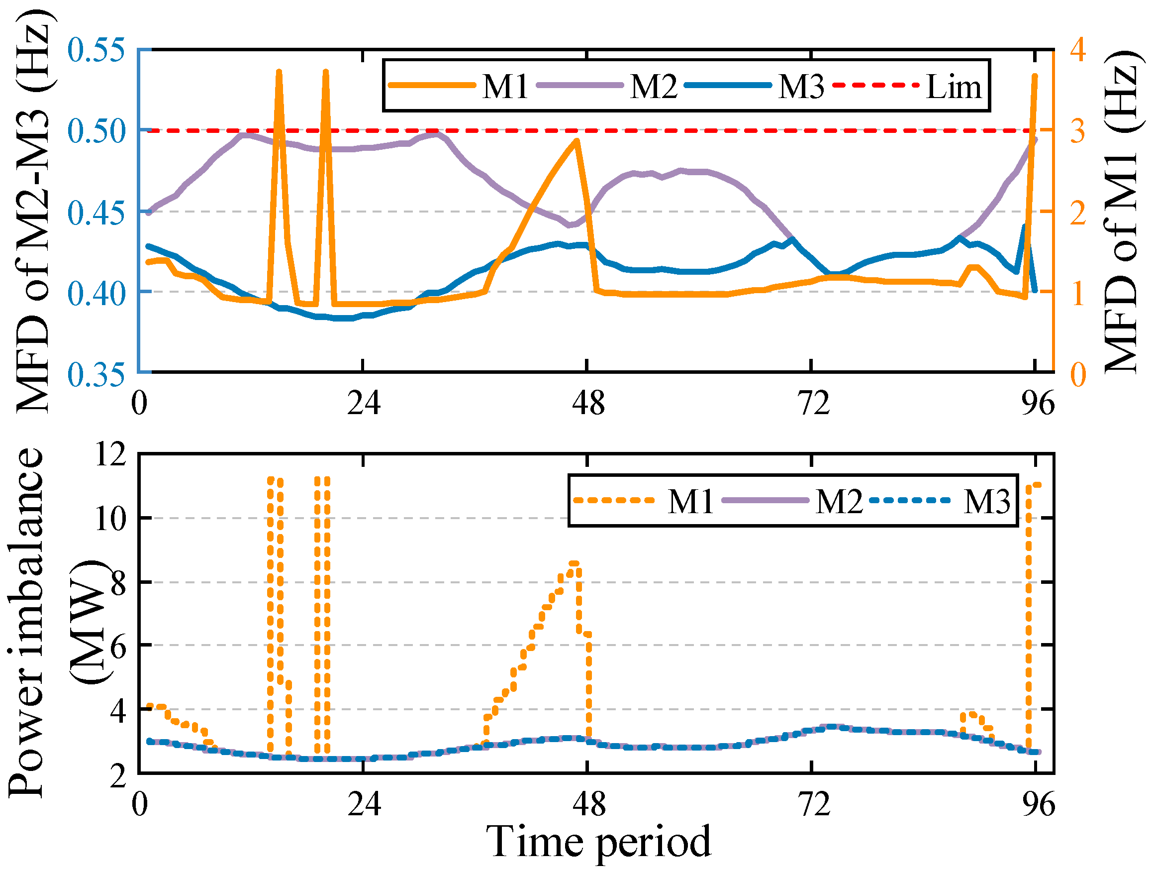 According to the derivations in Section 2, the constraints for RoCoF, MFD, and QSSFD are shown in (39)–(41), respectively: