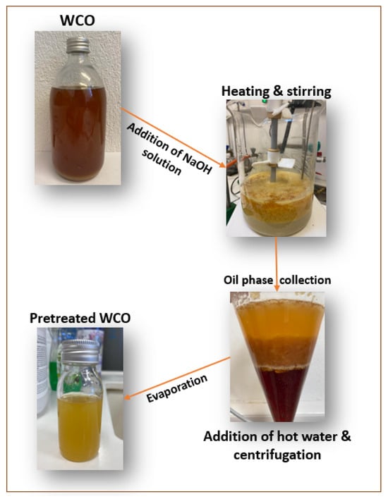 In the literature, some studies have investigated a pretreatment method of WCOs that is commonly referred to as chemical refining, which is composed of multiple steps (reduction of phospholipid content, neutralization, bleaching, odor reduction). This method is particularly advantageous because it minimizes oil loss during treatment []. More specifically, one of the stages of chemical refining is neutralization, which is targeted at reducing the levels of FFAs to improve the lipids’ quality for further processing.