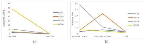 WCO samples’ acidity (a) and moisture (b) after the pretreatment.