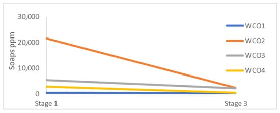 WCO samples’ soap content after the pretreatment (stage 1 refers to the neutralization reaction and stage 3 three refers to the termination of the centrifugations).