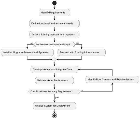 It begins with the identification of requirements and assessment of existing sensor systems. If gaps or inadequacies are found, additional sensors or upgrades are installed to ensure data availability and compatibility. The core of the process is a cyclical loop of model development, data integration, and performance validation. This iterative loop addresses inaccuracies and refines the system until it meets predefined accuracy requirements. Once validated, the system proceeds to final integration, resulting in a digital twin ready for deployment.