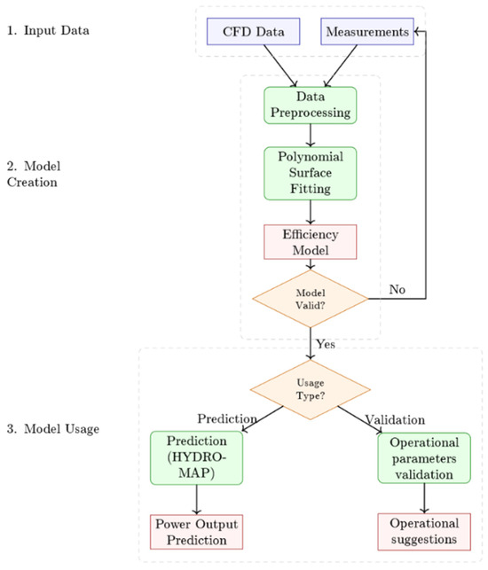 The HYDRO-MAP concept represents a hydrological modeling and flow prediction framework for integration within the Hydro System Digital Twin at the Wały Śląskie Hydropower Plant. As illustrated in the simplified workflow diagram (Figure 4), HYDRO-MAP employs a four-stage sequential process: