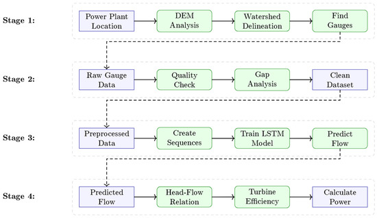 Stage 4—Power Estimation: The final stage calculates potential power generation based on predicted flow data. The computation incorporates head–flow relationships, operational constraints, and turbine efficiency parameters from the HYDRO-TIN module.