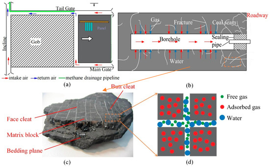 Schematic illustration of the extraction of CBM in an underground coal mine. (a) The distribution of the work face, tunnel, and borehole; (b) the structure of the borehole; (c) the components of coal; (d) the water and gas storage state in the coal.