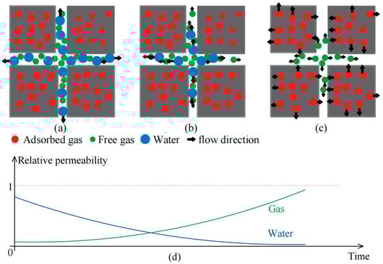 The gas depletion process can be divided into three stages based on the relative proportion of gas and water. The first stage involves the depletion pressure being above the gas desorption pressure; as a result, most gases remain in their original state and the water in the fracture network flows out (Figure 2a), forming the water single-phase flow. At the end of this stage, some of the free gas is dissolved in water and begins to move (Figure 2b) in a process known as bubble flow. Then, the fluid pressure continues to drop and is equal to or below the critical desorption pressure. The adsorbed gas begins to desorb and diffuses into the fracture (Figure 2c); additionally, some of the free gas depletes out due to the gas pressure gradient. At this stage, water flow remains predominant since water saturation exceeds gas saturation, resulting in a higher water relative permeability (Figure 2d). Throughout the depletion process, a significant amount of water is extracted, leading to decreased water saturation, diminished water relative permeability, and enhanced gas relative permeability (Figure 2d). This behavior also contributes to the rise in gas production. In this stage, the water flow changes from continuous flow to moisture transport. On the contrary, the gas content plays a dominant role. This stage comprises a significant portion of the overall depletion process.