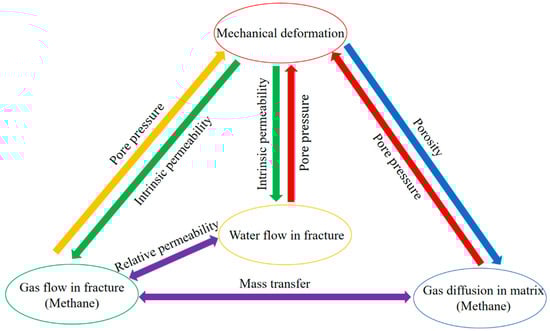 Several coupling processes are involved in the proposed model; the details are listed in the ensuing section and are schematically shown in Figure 3. (i) The effects of mechanical deformation on dual-phase flow within coal reservoirs: coal reservoir deformation has the ability to change the pore topology of both the fracture and matrix systems and, subsequently, the fluid flow properties, including the intrinsic permeability in the fracture system and the effective diffusion coefficient in the matrix system. (ii) The impact of fluid flow on mechanical properties: the gas drainage process has the ability to change the pore pressure and subsequently induce volume strain in the coal reservoir. Furthermore, the existence of water softens the coal reservoir, thus lowering the Young’s modulus of the coal seam. In summary, Young’s modulus varies with water saturation. Additionally, water saturation influences the relative permeability of the gas and water phases, which aligns with the relative permeability principles curve. There is gas mass transfer between the matrix and fracture systems.