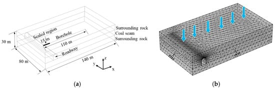 This study involved creating a three-dimensional geometrical model to simulate the impact of water saturation and induced mechanical anisotropy on the gas extraction efficiency via layer drilling holes. The model is established by referring to the geological conditions in the Wangpo coal mine, Shanxi province. The model features three strata groups, which are depicted in Figure 4. The upper and lower strata act as surrounding rock, measuring 140 m in length, 80 m in width, and 10 m in height. Positioned in the center of the model, the coal seam matches the dimensions of the surrounding rock. Meanwhile, a transportation roadway—10 m in height and 80 m in length—was inserted into the coal seam on the left-hand side. The excavation of a borehole with a diameter of 100 mm was conducted. The borehole measured 110 m in length and was perpendicular to the right-hand wall of the roadway. It is noteworthy that the initial 15 m of the section was sealed.
