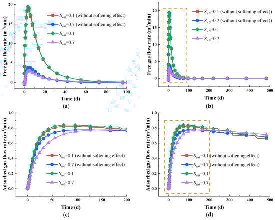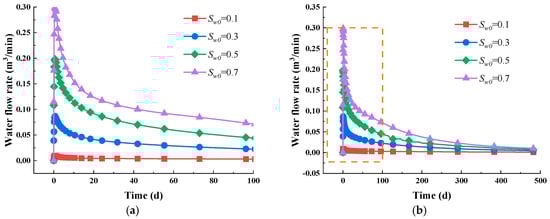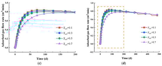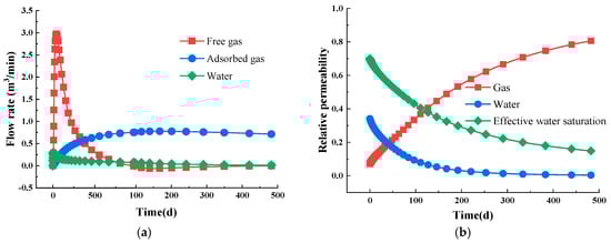 The simulation results reveal that during the gas extraction process, immersed water is initially produced, followed by the release of free gas and ultimately the desorption of adsorbed gas [63,64]. In the early stage, the production predominantly comprises water and free gas, while in the later stage, adsorbed gas becomes the primary output, as illustrated in Figure 5a. Throughout the evolution of the gas–water two-phase permeability, the effective water saturation progressively declines. This results in a corresponding decrease in the relative permeability of the water phase, as well as a concurrent increase in the gas relative permeability, as illustrated in Figure 5b. These results are not verified as an ideal conceptual model is established, aiming to produce some general conclusions rather than specific ones; for real mines, the geological conditions are extremely complex, which are difficult to truly replicate. Additionally, obtaining parameters can be challenging. Although the results have not been verified, the model remains applicable since the gas flow rate falls within a reasonable range.