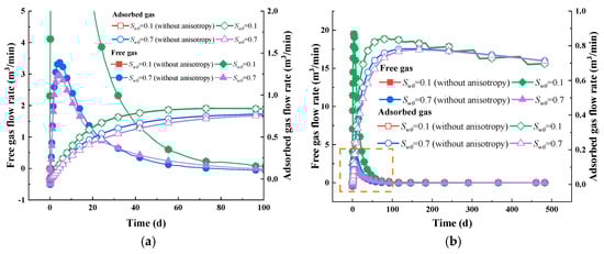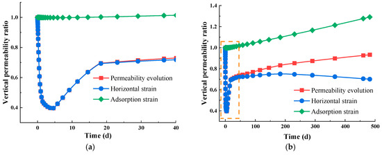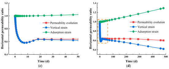 The permeability in the horizontal direction remains consistent with vertical deformation, as shown in Figure 6c,d. The early decrease and increase in permeability are also observed in the horizontal direction, which can also be explained by the dependence of Young’s module with water saturation. In the long period, the vertical strain exceeds the adsorption strain because of the lower Young’s modulus in perpendicular direction, leading to a decline in permeability.