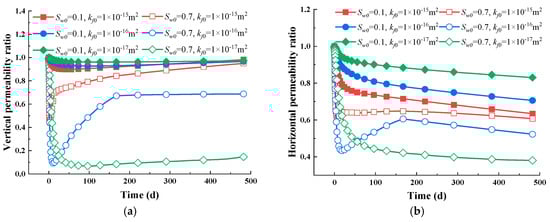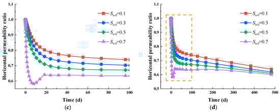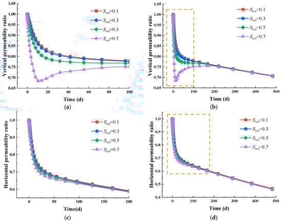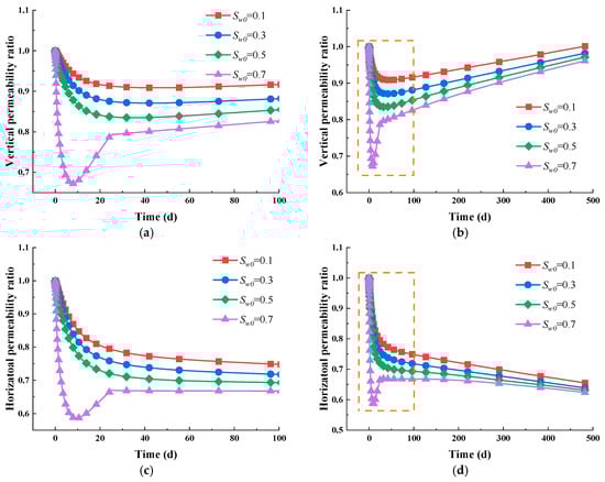 Intrinsic permeability evolution in varied directions. (a) Vertical permeability evolution in the short term; (b) vertical permeability evolution in the long term; (c) horizontal permeability evolution in the short term; (d) horizontal permeability evolution in the long term.