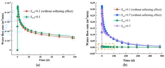 - The water immersion-induced changes in the mechanical properties have the ability to reduce the permeabilities in both the vertical and horizontal directions, especially in the former. When Sw0 is 0.7, the vertical permeability decreases by 60%, while the horizontal permeability decreases by 43%. Ultimately, the vertical permeability ratio stabilizes between 0.9 and 1.0, while the horizontal permeability ratio stabilizes in the range of 0.6 to 0.7.