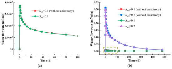 This study introduces a fluid flow–reservoir deformation coupling model that takes into account the mechanical anisotropy of coal seams, created through a blend of theoretical analysis and numerical simulation. The model incorporates the anisotropic characteristics of coal mechanical parameters and the effects of water softening in the gas–water two-phase flow process. It explores how the water immersion-induced changes in mechanical properties influence coal permeability and gas extraction production patterns. The following conclusions can be drawn: