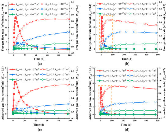 As illustrated in Figure 6a,b, the permeability in the vertical direction decreases first and then increases. During the early stage, permeability is primarily influenced by horizontal strain, while during the later stage, permeability is primarily impacted by adsorption strain [63]. In the initial stage, the high water saturation level significantly reduces Young’s modulus due to the weakening effect of the water. As the water is expelled, the fluid pressure decreases and the effective stress increases, resulting in a decrease in permeability. In the intermediate stage, as water continues to be discharged, the water saturation gradually decreases, leading to a gradual increase in Young’s modulus and, consequently, an increase in permeability. In the later stage, the water saturation levels off at a low value and Young’s modulus stays mostly unchanged. As gas is released, the fluid pressure drops and the effective stress increases, while the adsorption strain surpasses the horizontal strain, resulting in a higher permeability [65,66].