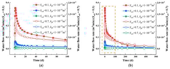 - The impact of initial permeability on the gas depletion characteristics depends on the level of water saturation. Under water-scarce conditions (Sw0 = 0.1), differing initial permeability values have a minimal effect on the evolution pattern of intrinsic permeability. In contrast, in water-abundant conditions (Sw0 = 0.7), increased initial permeability values promote a faster return to the initial permeability; meanwhile, the permeability is significantly reduced and stays at a lower value when the initial permeability is low.