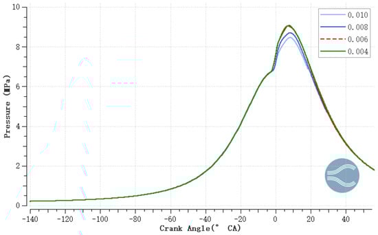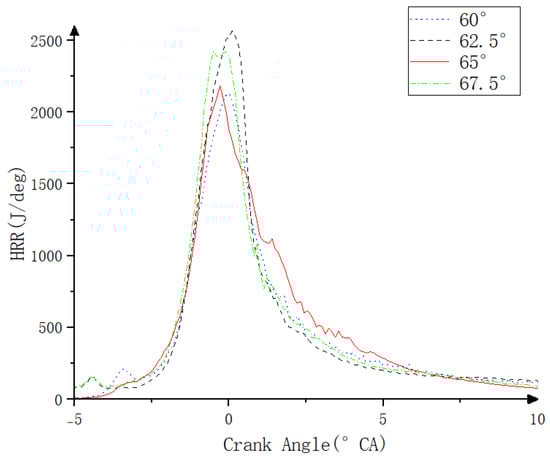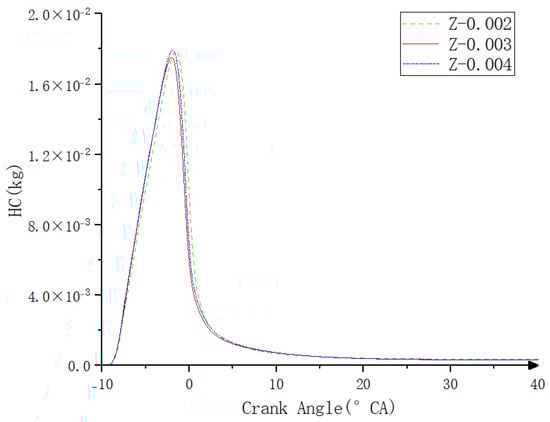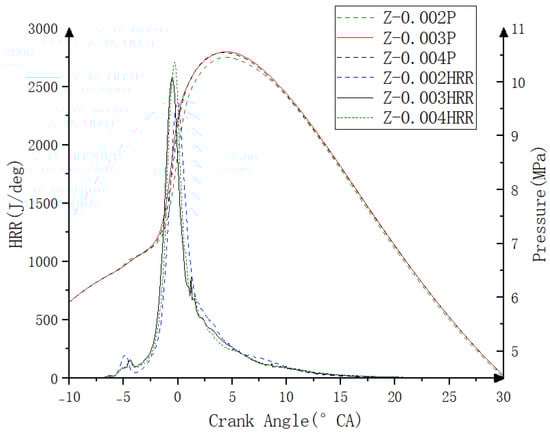 Figure 6. Following an ignition delay of approximately −1 °CA, the diesel fuel undergoes auto-ignition. During the injection process, the diesel fuel experiences shear forces, which entrain the surrounding mixture. This promotes further mixing with the in-cylinder gas during atomization and evaporation. The initial stage of combustion is predominantly driven by diesel combustion, characterized by a rapid heat release rate, as evidenced by the HRR curve. However, methanol near the flame kernel ignites rapidly. The interaction between diesel’s diffusion combustion and methanol’s premixed combustion significantly enhances the combustion rate. The hydroxyl groups in methanol produce a significant quantity of hydroxyl radicals, thereby accelerating the oxidation process of methanol. As Z-0.004 is positioned deeper within the engine cylinder compared to Z-0.003 and Z-0.002, the injected methanol is closer to the pilot flame. Consequently, combustion initiates earlier at Z-0.004, and the reaction becomes highly intense during the subsequent combustion process. As the pilot flame propagates within the cylinder, the combustion rate progressively increases. The heat release rate stabilizes until 7 °CA after top dead center (TDC), at which point combustion is largely complete. At 12 °CA after TDC, the HRR attains its maximum value, after which the curve declines steadily and eventually approaches zero.