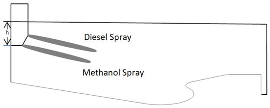 The injection position is determined by the nozzle location, specified as the longitudinal distance h from the cylinder head, as illustrated in