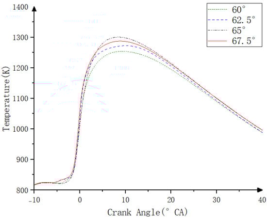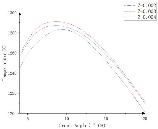 During the expansion phase, combustion persists, with the temperature peaking before gradually declining. The temperature field at the Z-0.003 m position reaches a higher peak temperature, signifying more intense combustion and enhanced combustion efficiency at this location. The temperature field at the Z-0.004 m position exhibits lower temperatures, likely due to fuel impingement on the piston wall, leading to incomplete combustion. At the Z-0.002 m position, the nozzle is positioned closer to the cylinder head, resulting in a shallower methanol spray penetration depth and relatively uniform fuel–air mixing. However, the short spray distance may prevent complete combustion of some fuel, leading to a more uniform temperature field distribution but a lower peak temperature. At the Z-0.003 m position, the nozzle distance is optimal, allowing the methanol spray to fully mix with the air. This results in high combustion efficiency and a temperature field with a higher peak temperature, indicating a more intense combustion process. At the Z-0.004 m position, the nozzle is positioned deeper, resulting in greater methanol spray penetration. This may cause some fuel to impinge on the piston wall, leading to localized temperature non-uniformity, reduced combustion efficiency, and a lower peak temperature in the temperature field.