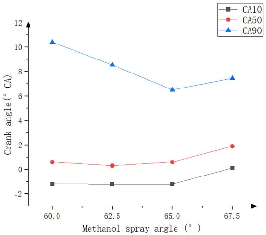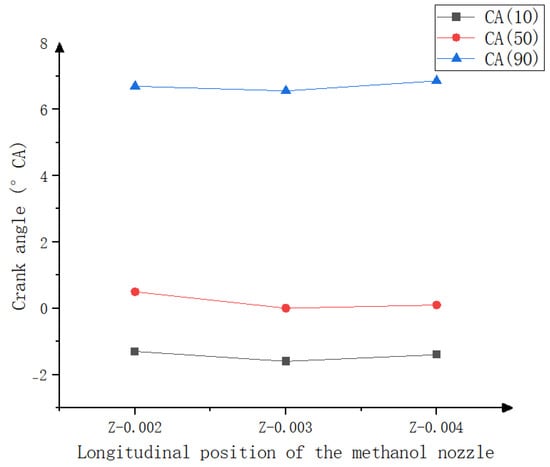 Figure 8, as the methanol nozzle position is adjusted downward, the ignition delay (CA10) initially decreases and then increases, with the combustion center (CA50) and combustion end (CA90) following a similar pattern. This phenomenon is attributed to the gradual shift in the fuel-rich zone from the piston wall to the piston bowl, enhancing fuel–air mixing and thereby improving combustion efficiency. However, as the nozzle position is moved further downward, the spray penetration distance increases, leading to fuel impingement on the piston wall and subsequent cooling, which reduces mixture uniformity and combustion efficiency. Additionally, the downward adjustment of the methanol nozzle position diminishes the interaction between methanol and diesel sprays. The methanol absorbs the high latent heat during vaporization, initially reducing the cylinder temperature and prolonging the ignition delay. This shifts the combustion process backward, shortening the combustion duration and concentrating heat release. At a methanol injection distance of 3 mm, the interaction between the spray and in-cylinder airflow is optimized, resulting in a uniform mixture. This phenomenon can be attributed to the conservation of momentum and the evaporation rate of the spray. A shorter injection distance reduces spray penetration depth, preventing fuel impingement on the cylinder wall and thereby enhancing mixture uniformity. The 3 mm injection distance corresponds to the earliest CA10 and CA50 as well as the longest CA10-CA90 duration. This advances the combustion phase, extends the combustion time, and increases the temperature during the expansion stroke.