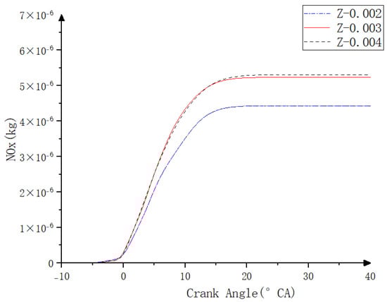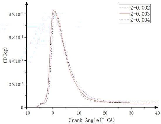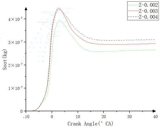 Figure 12 investigate the impact of the longitudinal position of the methanol nozzle on the emissions of soot, NOx, HC, and CO. The results demonstrate that the longitudinal position of the methanol spray significantly influences the emission characteristics. At the Z-0.003 position, the emissions of soot and NOx reach their peak, primarily due to the proximity of the methanol spray to the ignition flame, which intensifies the combustion process, leading to increased localized high-temperature and oxygen-deficient regions that promote the formation of soot and NOx. In contrast, at the Z-0.004 position, the deeper penetration of the methanol spray into the cylinder enhances the interaction between the spray and airflow, resulting in a more uniform distribution of the air–fuel mixture. This reduces localized high-temperature and oxygen-deficient regions, thereby decreasing the emissions of soot and NOx. HC emissions are higher at the Z-0.002 position, mainly due to the weaker interaction between the spray and airflow, which leads to an uneven distribution of the air–fuel mixture. As a result, some methanol fails to combust completely, forming unburned HC. As the nozzle position moves downward, HC emissions initially increase and then decrease, indicating that an optimal nozzle position can improve the uniformity of the air–fuel mixture and reduce the formation of unburned HC. The variation trend of CO emissions is similar to that of soot and NOx, reaching its peak at the Z-0.003 position, primarily due to the increased generation of incomplete combustion products caused by localized high-temperature and oxygen-deficient regions. At the Z-0.004 position, the more uniform distribution of the air–fuel mixture enhances combustion efficiency, leading to a reduction in CO emissions. In summary, the longitudinal position of the methanol nozzle significantly influences the emission characteristics of the engine. An optimal nozzle position can effectively improve the uniformity of the air–fuel mixture, thereby reducing the generation of emissions, particularly CO and HC.