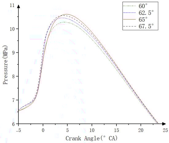 Figure 7, the average in-cylinder temperature under the three conditions is nearly identical. The longitudinal nozzle distance exhibits minimal influence on the average temperature before top dead center (TDC). As the piston descends, the average temperature associated with different longitudinal nozzle distances progressively rises. After TDC, the average temperature slightly rises with increasing longitudinal nozzle distance, resulting in higher exhaust losses. The increased heat loss reduces thermal efficiency, thereby increasing elevated carbon emissions. At a longitudinal nozzle distance of 3 mm, the temperature reaches a higher level. The variation in cylinder pressure before TDC, driven by piston compression and diesel auto-ignition, is influenced by the engine’s compression ratio and diesel ignition characteristics. At the end of the compression stroke, the formation of a low-pressure zone facilitates rapid evaporation of the methanol spray, promoting the formation of a homogeneous mixture after TDC. Simultaneously, a greater amount of methanol from a longer longitudinal nozzle distance impinges on the piston wall, enhancing spray breakup and fostering the formation of a uniform mixture.
