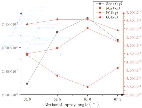 11] revealed that HC emissions are strongly correlated with the uniformity of the air–fuel mixture and combustion efficiency. The results of this study corroborate these findings and indicate that the non-uniform distribution of methanol spray contributes to localized high temperatures, oxygen-deficient zones, and unburned regions, thereby influencing emission characteristics.