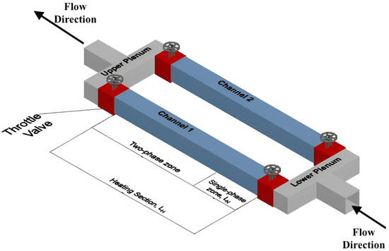 Energy is an indispensable driving force for the development of modern society. With the rapid development of science and technology and increasingly severe environmental problems, people’s demand for efficient energy conversion and utilization is growing exponentially [1,2,3]. To ensure safe and reliable power generation even under extreme conditions, advanced nuclear reactor concepts are gradually being developed. For compact nuclear reactor cores, through the optimization of fuel arrangement, coolant channel design, and material selection, their volume and weight have been significantly reduced while maintaining or enhancing power density. Two-phase flow instability in rectangular channels composed of plate fuel assemblies in the reactor core becomes an important factor affecting reactor safety [4]. The effect of hydrodynamic instabilities, such as density wave oscillation, poses a threat to the system. Flow instabilities would lead to boiling crises, causing mechanical or thermal stress, which compromises the integrity and performance of the system [5,6,7]. Thus, it is necessary to understand the onset of two-phase flow instabilities in order to prevent such an occurrence.