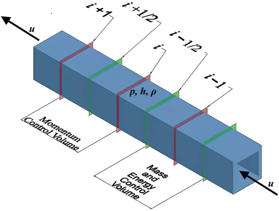Spatial discretization processes are depicted in Figure 2, which illustrates the flow through a rectangular channel with a uniform cross-sectional area. Within this framework, scalar variables such as pressure, enthalpy, and density are assessed at the control volume centers. In contrast, velocity vectors are strategically located at the boundary interfaces between neighboring control volumes.