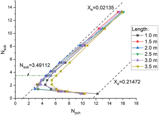 To investigate the effect of channel length on two-phase flow instability, dimensionless numbers Npch and Nsub were evaluated over a range of channel lengths and inlet subcooling temperatures. These values were used to generate a comprehensive stability map, shown in Figure 4, which visually represents the stability variations at different channel lengths and subcooling conditions. The results indicate that systems with channel lengths of 1 m exhibit a larger stable region compared to those with lengths between 1.5 m and 3 m. Within this range, the stable region gradually expands. Notably, the system with a channel length of 3.5 m shows the largest stable area among the six marginal stability boundary (MSB) lines. The enhanced stability associated with longer channel lengths can be ascribed to the interaction between flow dynamics and the thermodynamic properties of the fluid. Longer channels exhibit greater fluid inertia, which enhances stability by dampening oscillations. However, as the channel length increases, more complex interactions arise between pressure waves and flow, potentially decreasing stability in the initial stages. This balance between inertia and damping effects is described by the momentum conservation equation, which encapsulates the dynamic behavior of the flow in relation to channel length. The inertia term in the equation, , accounts for the change in momentum over time. In longer channels, the increased mass leads to higher inertia, dampening perturbations and stabilizing the flow. Furthermore, stability is influenced by the efficiency of heat transfer and the rate of phase change. Longer channels provide more surface area for heat transfer, which can stabilize the flow by reducing thermal gradients. The energy conservation equation reflects the balance of heat transfer and phase change. The enthalpy change term, , and the pressure change term, , represent how density changes with enthalpy and pressure. Longer channels ensure more uniform heat distribution, reducing pressure fluctuations and enhancing stability. Lastly, longer channels can distribute flow and pressure drops more evenly, contributing to overall stability. The matrix components represent the contributions of enthalpy and pressure changes to density variations.