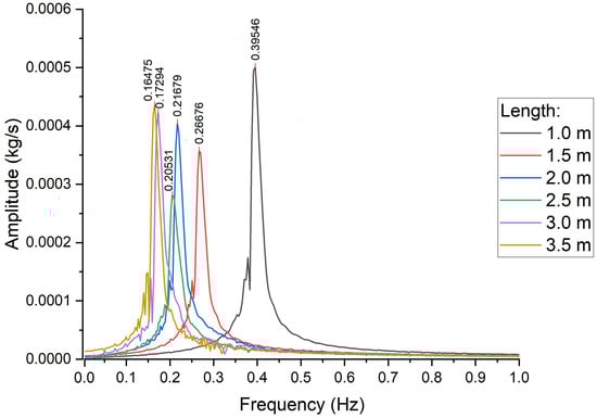 Figure 5 presents the Fast Fourier Transform (FFT) analysis for various channel lengths, depicting the amplitude of oscillations as a function of frequency. This analysis was performed at the onset of divergent oscillations, with a subcooling number of 3.49112. The data reveal significant variations in both oscillation frequencies and amplitudes across different channel lengths, all within the same time frame. The system with 1.0 m channel lengths exhibits the highest peak frequency at 0.39546 Hz. As the channel length increases, the peak frequency decreases, with the system at 3.5 m showing the lowest peak frequency of 0.16475 Hz. This inverse relationship between oscillation frequency and channel length can be explained by the physical constraints of the channels. Specifically, the frequency is inversely proportional to the channel length. With a constant flow rate maintained across all six systems, fluid particles in longer channels take more time to traverse the entire length, leading to a reduction in oscillation frequency. This relationship is governed by principles of wave propagation and resonance. Longer channels are capable of accommodating longer wavelengths because of the greater distance provided for oscillations. Additionally, wave speed is determined by the square root of the bulk modulus of elasticity of the fluid divided by its density, further influencing the oscillation dynamics in longer channels.
