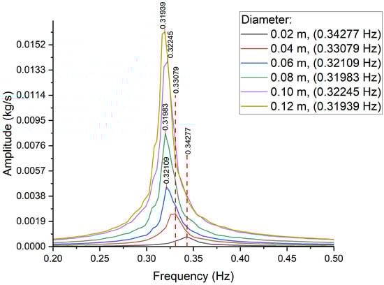 Figure 6 presents the stability map for six systems, illustrating the relationship between equivalent diameter and system stability. The system with an equivalent diameter of 0.02 m demonstrates the largest stable region. As the equivalent diameter increases, the marginal stability boundary (MSB) shifts leftward, indicating a reduction in system stability. However, the leftward shift in the MSB for systems with equivalent diameters ranging from 0.04 m to 0.12 m is minimal. The increase in equivalent diameter influences the mass flow rate, which, in turn, enhances heat transfer and phase change dynamics. Heat transfer is directly proportional to mass flow rate, meaning that an increased flow rate facilitates more efficient heat exchange and phase transitions. This, however, can result in larger thermal gradients, which destabilize the system by causing localized hotspots and uneven temperature distributions. These gradients, particularly in the presence of high heat input, can lead to rapid fluctuations in pressure and temperature within the channel, increasing the likelihood of oscillations and instability. While an increase in equivalent diameter typically reduces the frictional pressure drop, theoretically contributing to a more stable system, the results in Figure 6 suggest otherwise. It seems that the destabilizing impacts stemming from enhanced heat transfer and phase change dynamics surpass the stabilizing effect brought about by the reduced pressure drop. Additionally, Figure 7 displays the Fast Fourier Transform (FFT) analysis performed at the onset of divergent oscillations with a subcooling number of 8.13467. This analysis highlights a reduction in oscillation frequency as the equivalent diameter increases, further supporting the correlation between channel geometry and flow stability.