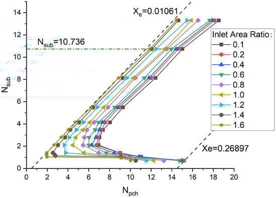 Figure 8 illustrates the effect of the inlet area ratio on system stability. As the inlet area ratio increases, the stability of the system decreases. Specifically, a higher inlet area ratio leads to reduced stability. The inlet area ratio significantly impacts the distribution of mass flow between the two channels. For systems with a higher inlet area ratio (e.g., 1.6), Channel 1, having a larger cross-sectional area, experiences a higher mass flow rate compared to Channel 2. This higher flow rate results in lower fluid velocity in Channel 1, reducing the subcooling effect due to decreased residence time, which, in turn, diminishes heat transfer efficiency. The reduced subcooling makes the fluid in Channel 1 more susceptible to boiling, thereby destabilizing the two-phase flow system. Additionally, the increased mass flow rate in Channel 1 elevates the phase change number (Npch), further contributing to instability. Conversely, Channel 2, with a smaller cross-sectional area, has a lower mass flow rate, leading to higher fluid velocity and greater subcooling. This results in a lower phase change number, thereby reducing instability. The difference in mass flow rates between the two channels disturbs the equilibrium of the system. This disturbance leads to non-uniform phase transition rates and further exacerbates system instability. With a lower inlet area ratio (e.g., 0.1), Channel 1 has a smaller cross-sectional area, resulting in a lower mass flow rate and higher velocity. This higher velocity enhances the fluid’s subcooling, making it less prone to boiling and thereby increasing system stability. The decreased phase change number (Npch) also contributes to enhanced stability, as it indicates less extensive phase change relative to the heat input.