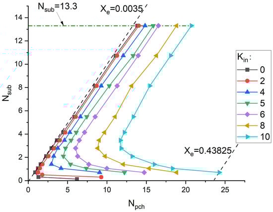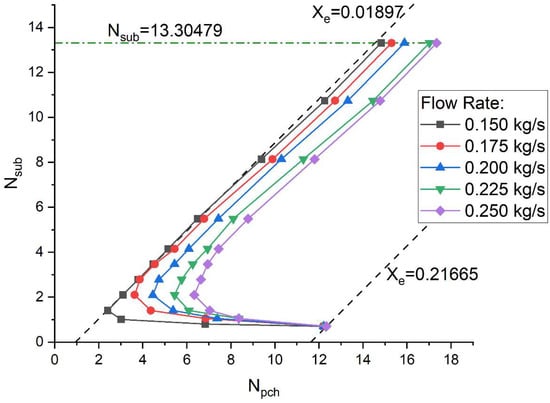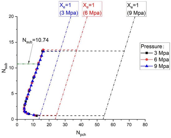 This section looks into the effects of pressure on the stability of the system, with system parameters shown in Table 9. At higher pressures, the latent heat of vaporization, , decreases because the liquid and vapor phases become closer in terms of enthalpy. To maintain a similar Nsub, the enthalpy difference between the fluid at saturation and the fluid at the inlet, , must increase. This results in a higher required subcooling temperature at the inlet for higher pressure systems.