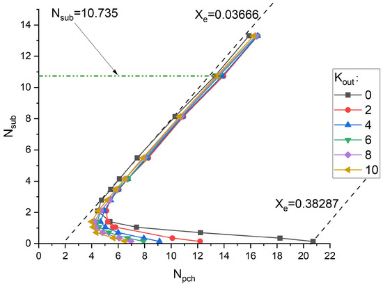 In contrast to the inlet resistance coefficient, an increase in the outlet resistance coefficient reduces system stability. As illustrated in Figure 12, a reduction in the stable region is more pronounced at lower subcooling numbers. Higher outlet resistance coefficients increase the pressure drop at the channel outlet, leading to higher back pressure. This back pressure generates fluctuations in flow rate and pressure within the channels, potentially destabilizing the flow. Additionally, increased outlet resistance can result in greater energy dissipation and flow reversal, further contributing to instability.