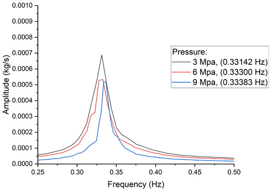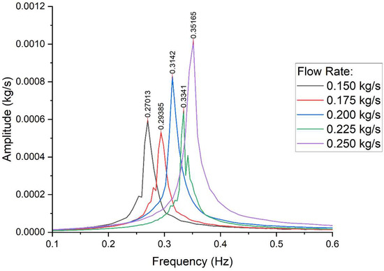 An increase in mass flow rate across both channels leads to greater system stability, as shown in Figure 14. Correspondingly, Figure 15 reveals that the frequency of oscillations rises with an increasing mass flow rate. Higher mass flow rates result in elevated velocities, which, in turn, increase the Reynolds number. A higher Reynolds number signifies that inertial forces dominate over viscous forces. Although a high Reynolds number often suggests more turbulent flow, this turbulence can enhance mixing and promote a more uniform temperature distribution, thereby reducing localized instabilities. Additionally, a higher Reynolds number results in an increased Nusselt number, which improves the heat transfer coefficient. This enhanced heat transfer leads to more uniform temperature distributions, further reducing thermal gradients that could contribute to system instability.