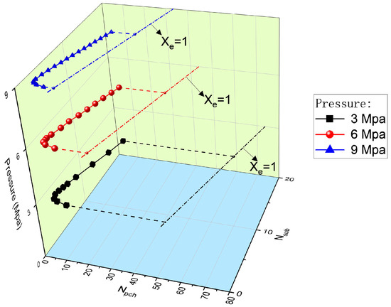 As illustrated in Figure 16 and Figure 17, increasing system pressure has a minimal direct effect on the marginal stability boundary (MSB) line. However, it indirectly enhances system stability by reducing the instability region. Figure 18 demonstrates that the frequency of oscillations shows only a slight increase when the subcooling number (Nsub) is 10.74. The reduction in the instability region can be attributed to the leftward shift of the Xe (exit quality) line. Higher pressures increase the density of the liquid phase and improve the heat transfer coefficient for nucleate boiling, resulting in more efficient and stable heat transfer. As pressure rises, the density of the liquid phase increases, thereby enhancing the efficiency of heat transfer from the surface to the fluid. Additionally, the boiling point of the fluid rises with increased pressure, which decreases the specific enthalpy of vaporization. This shift affects the Xe line, leading to a reduction in the instability region for systems operating at higher pressures.