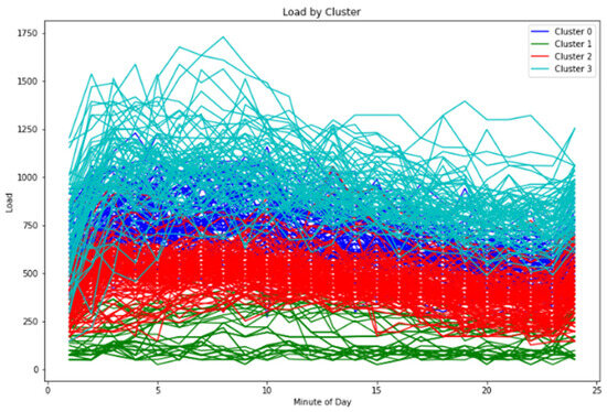 Using the optimal number of clusters, a clustering analysis was performed on the daily electricity load data for the entire year, as shown in Figure 2. From Figure 2 and the hourly electricity load curve for the entire year, it is evident that: Cluster 0 is primarily concentrated in the winter months of January, February, March, and December; Cluster 1 corresponds to long holidays, particularly important national holidays; Cluster 2 mainly represents the transitional seasons of April, May, October, and November; and Cluster 3 is mainly concentrated in the summer months of June to September.