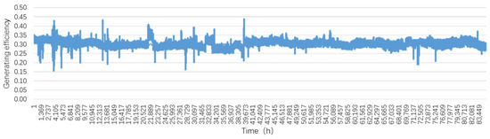 The fuel cell operation data used in this study are sourced from a university in Japan. The fuel cell power generation system started operating in June 2001 and ceased operation in 2011 due to a malfunction, with a total operating time of approximately 80,000 h. The operational data of the fuel cell system over the past decade were analyzed and organized, with a focus on summarizing the power generation efficiency. The aim is to study the relationship between the operational period of the fuel cell and its power generation efficiency. The hourly power generation efficiency data of the fuel cell system over the past ten years are shown in Figure 4. A polynomial fitting approach was applied to the hourly efficiency curve, using 1st to 6th order equations, as detailed in Table 1.