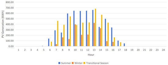 PV system operation strategy: The PV system operates based on sunlight intensity, prioritizing power supply to the load. If there is surplus electricity, it charges the energy storage system. If there is excess power that cannot be stored, it is fed into the grid. Figure 5 shows the PV output operation during the summer, winter, and transitional seasons.