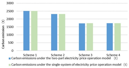 From the carbon emission results of Scenarios 1 and 2, it can be observed that the carbon emissions are identical for both operational models. For Scenarios 3 and 4, due to differences in high demand/flat/valley/peak time slots and the integration of the PV system, slight variations in carbon emissions exist between the two operational models.