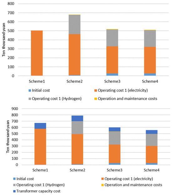 Based on the typical daily load profiles, the annual costs for Scenarios 1 to 4 under both operational models have been calculated. The total annual costs take into account the initial investment, energy consumption costs, operation and maintenance (O&M) costs, capacity costs, and other components. A horizontal comparison under the two operational models and a vertical comparison between the plans are presented in Table 15 and Table 16 and Figure 7 and Figure 8.