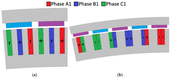 Machine winding layouts: (a) 480s/160p and (b) 192s/160p. Note that for the 480s/160p machine a full winding periodicity is displayed, and for the 192s/160p only half the winding periodicity is displayed.