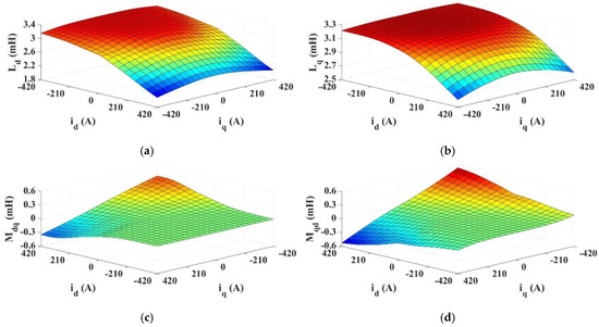 Apparent inductances of 480s/160p machine. (a) Ld, (b) Lq, (c) Mdq, and (d) Mqd.