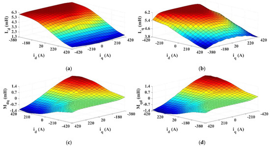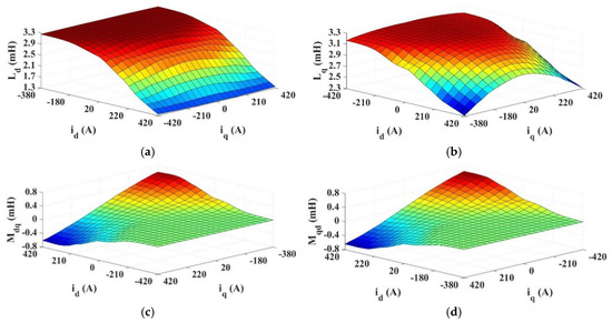 The d- and q-axis flux linkages of the machine could then be measured for each case, and the inductances were calculated by subtracting the d- and q-axis flux linkages [ and ] at and , respectively, from the d- and q-axis flux linkages [ and ] at and , respectively. This produced a 3D map of both self- and mutual inductances in the dq-frame based on the apparent change in inductance with applied current. The apparent inductances were calculated across all cases using the following equations: