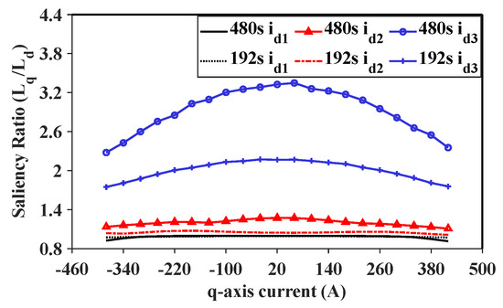 Saliency ratio using incremental inductances under three d-axis currents of 480s/160p and 192s/160p machines. id1 = −420 A, id2 = 20 A, and id3 = 420 A.
