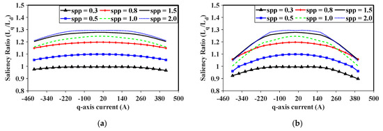 Saliency ratio for different spp number machines across q-axis currents. (a) Apparent inductances used and (b) incremental inductances used.