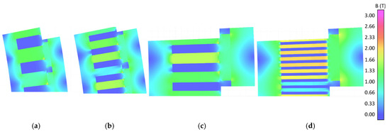 Flux saturation within the teeth of different-spp-number 3 MW machines: (a) 192s/160p (spp = 0.4), (b) 384s/160p (spp = 0.8), (c) 480s/160p (spp = 1.0), and (d) 960s/160p (spp = 2.0).